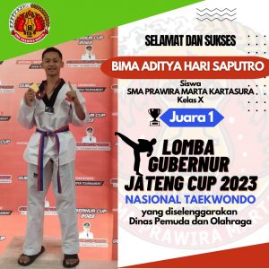 Dengan penuh kebanggaan, SMA Prawira Marta meraih prestasi gemilang sebagai juara pertama dalam kompetisi taekwondo bergengsi, Gubernur Jawa Tengah Cup 2023. Kompetisi yang diadakan oleh Dinas Pemuda dan Olahraga ini telah membuktikan keunggulan SMA Prawira Marta dalam dunia olahraga, khususnya dalam cabang taekwondo.